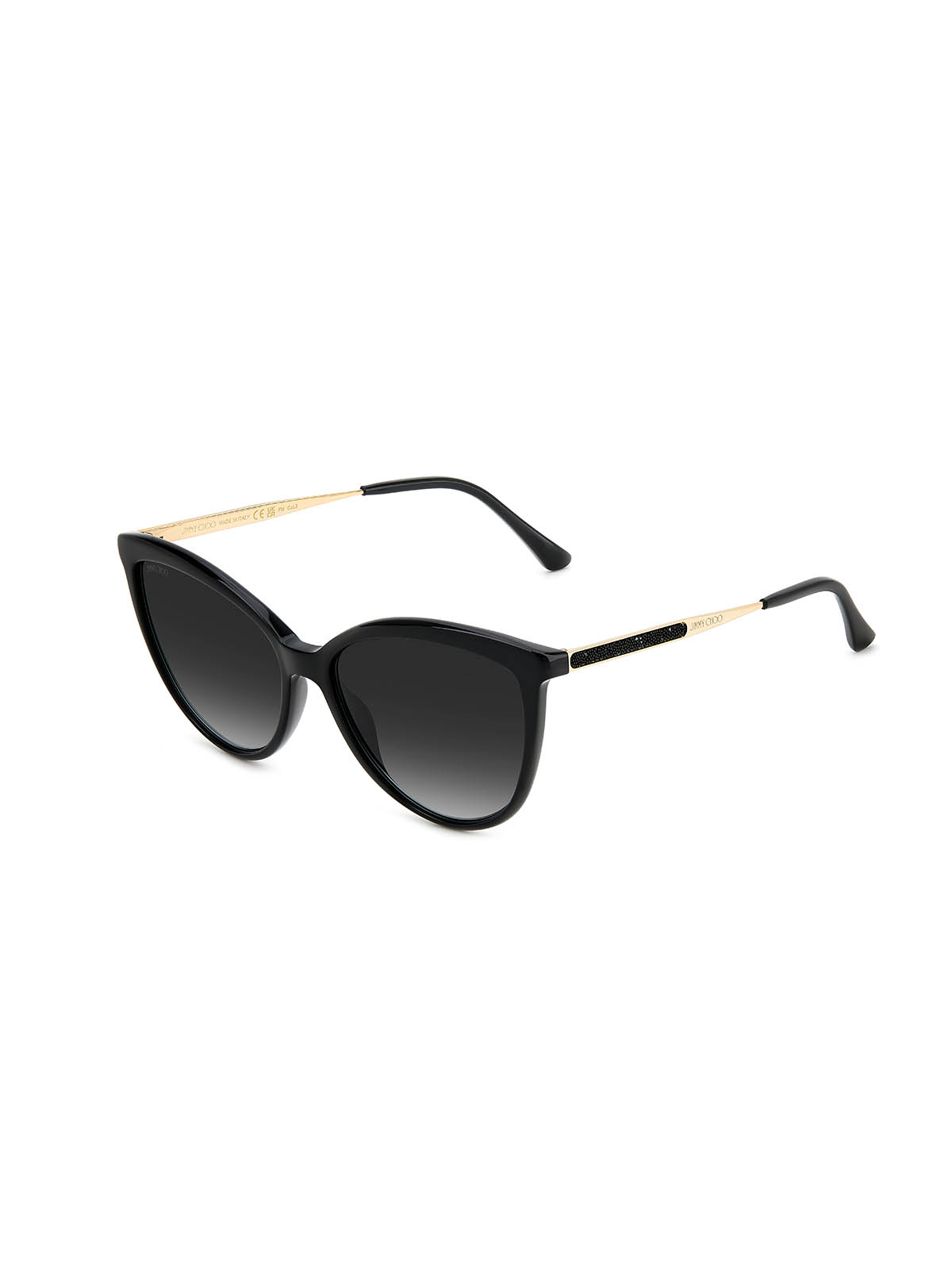 Okulary przeciwsłoneczne JIMMY CHOO BELINDA/S 807 to modna kobieca oprawka o kształcie kociego oka. Czarna oprawka wykonana została z lekkiego w użytkowaniu i jednocześnie trwałego tworzywa - octanu. Jej czarny kolor kontrastuje ze złotymi, metalowymi zausznikami. Eleganckim akcentem są zdobienia z kryształków Swarovskiego umieszczone na bokach zauszników. Wygodę użytkowania dodatkowo zapewniają miękkie zakończenia zauszników.