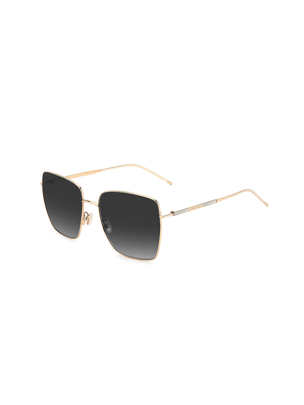 JIMMY CHOO DAHLA/F/SK 0009O to lekkie kobiece okulary przeciwsłoneczne. Duże, kwadratowe szkła o chłodnym, szarym odcieniu, otaczają subtelne, metalowe ramki w złotym kolorze. Pasujące do oprawki złote zauszniki urozmaicone są brokatowym zdobieniem. To bardzo kobieca i elegancka propozycja dla miłośniczek stylu glamour.