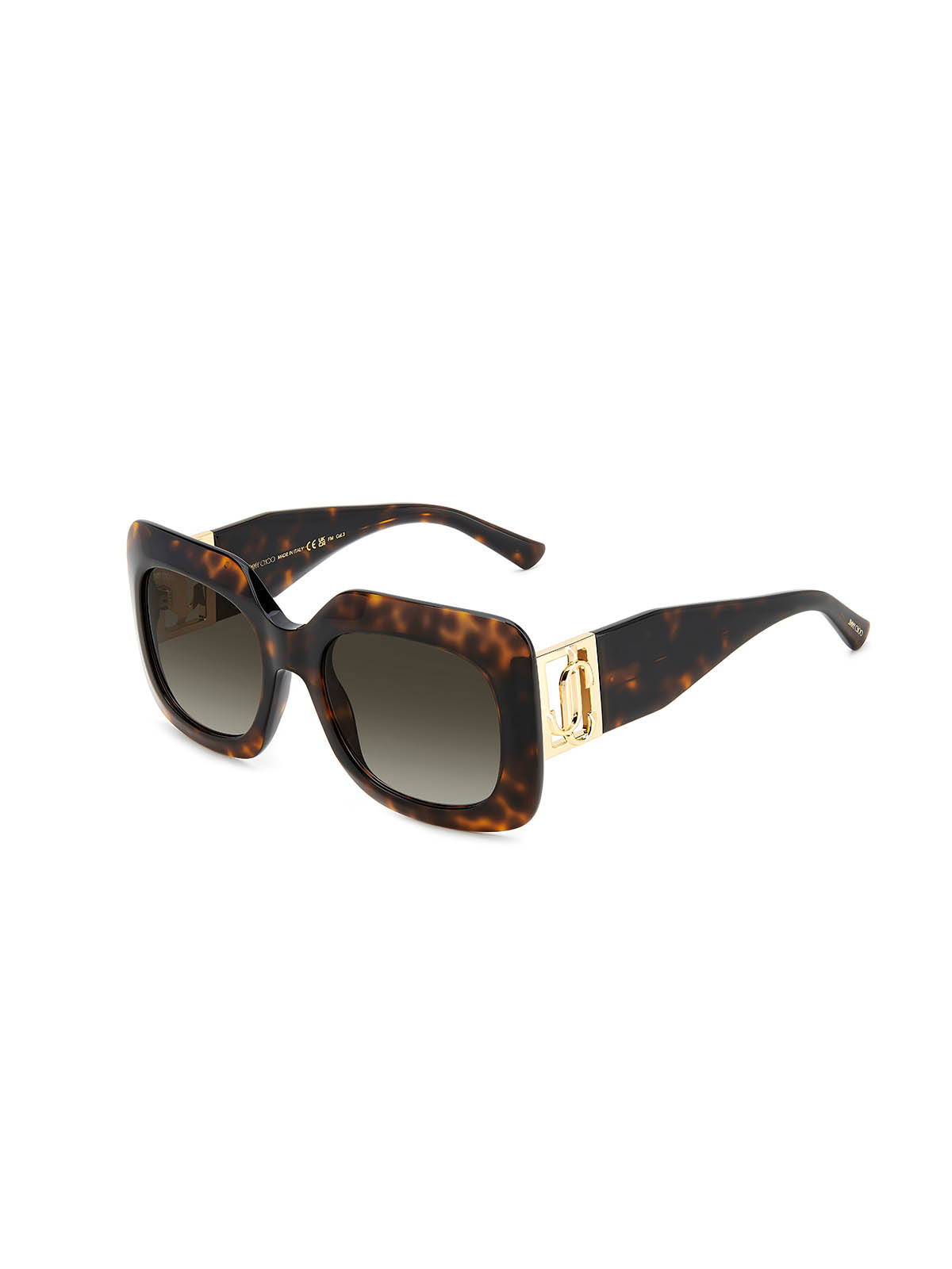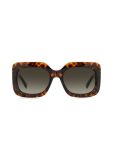 JIMMY CHOO GAYA/S 086 to modne i odważne okulary przeciwsłoneczne. Duże, kwadratowe i wyraziste oprawki charakteryzują się szeroką ramką i zausznikami ze złotym logotypem marki. Szylkretowy kolor opraw podkreśla charakter okularów. Całość wykonana jest z lekkiego i trwałego tworzywa - octanu, co gwarantuje komfort noszenia i wysoką jakość wykonania.