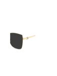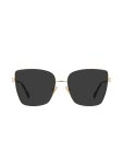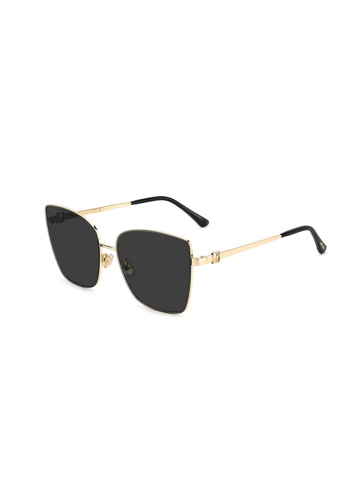 JIMMY CHOO VELLA/S 2M2 to okulary przeciwsłoneczne o dużej, kwadratowej oprawie. Czarne szkła umieszczone są w kontrastującej metalowej ramce w kolorze złota, która komponuje się z również złotymi zausznikami. Dla komfortu noszenia dodano czarne plastikowe zakończenia zauszników. Całość prezentuje się elegancko i szykownie.